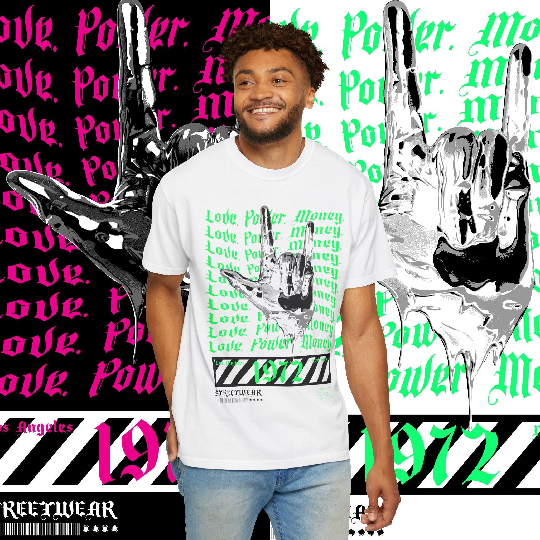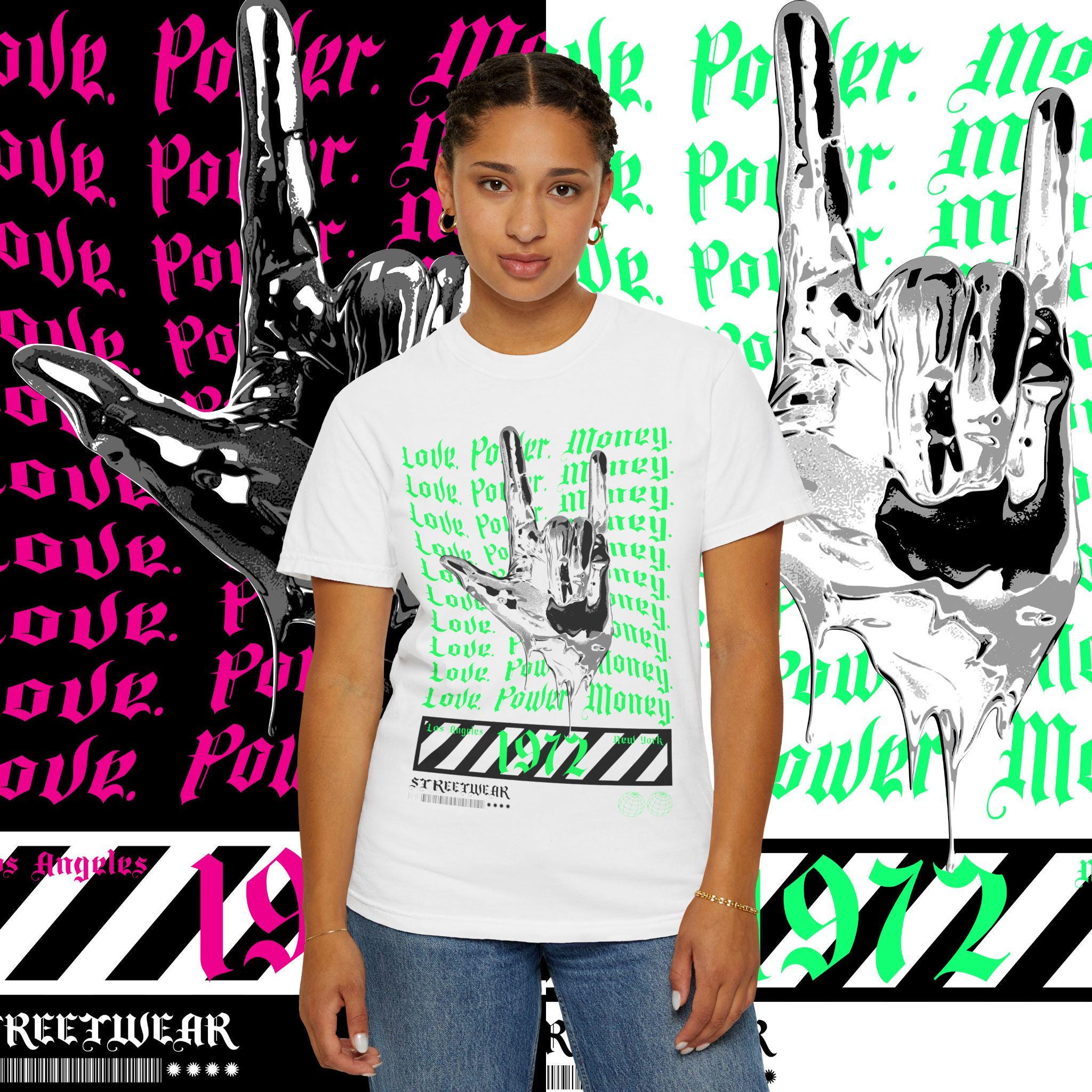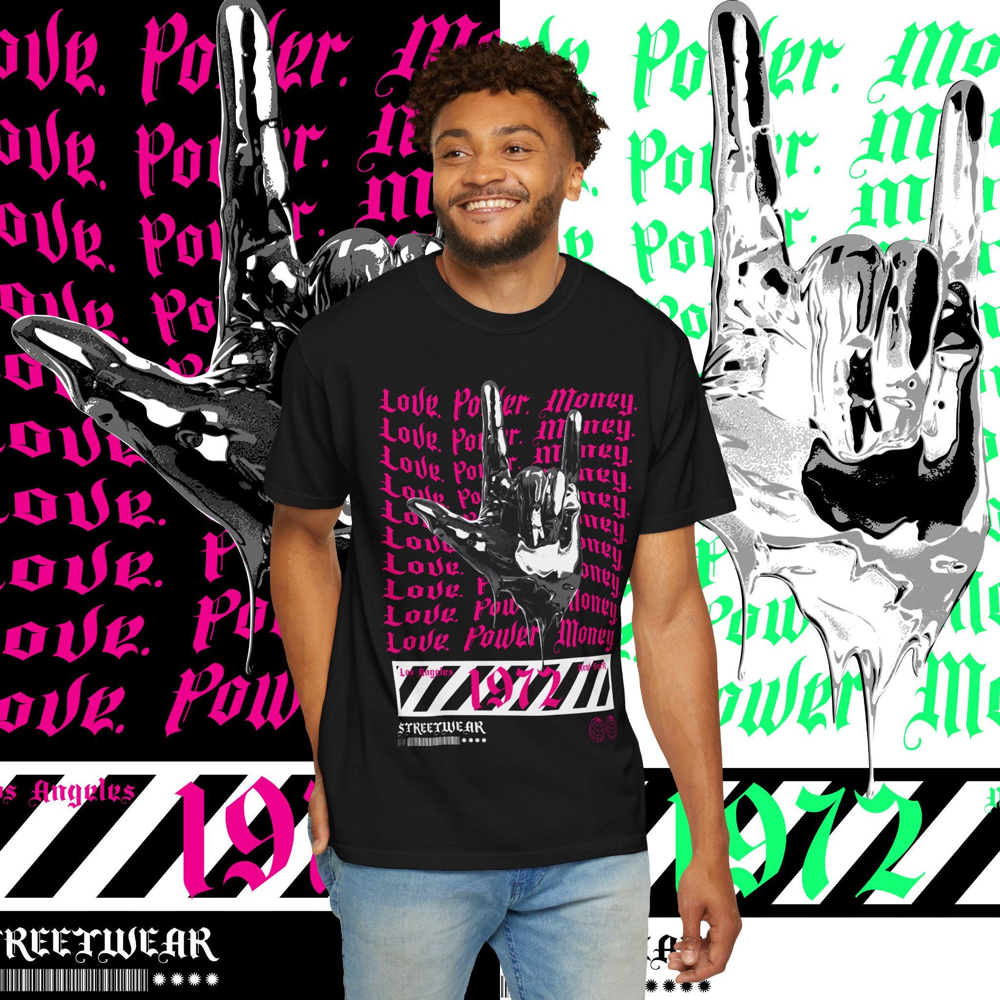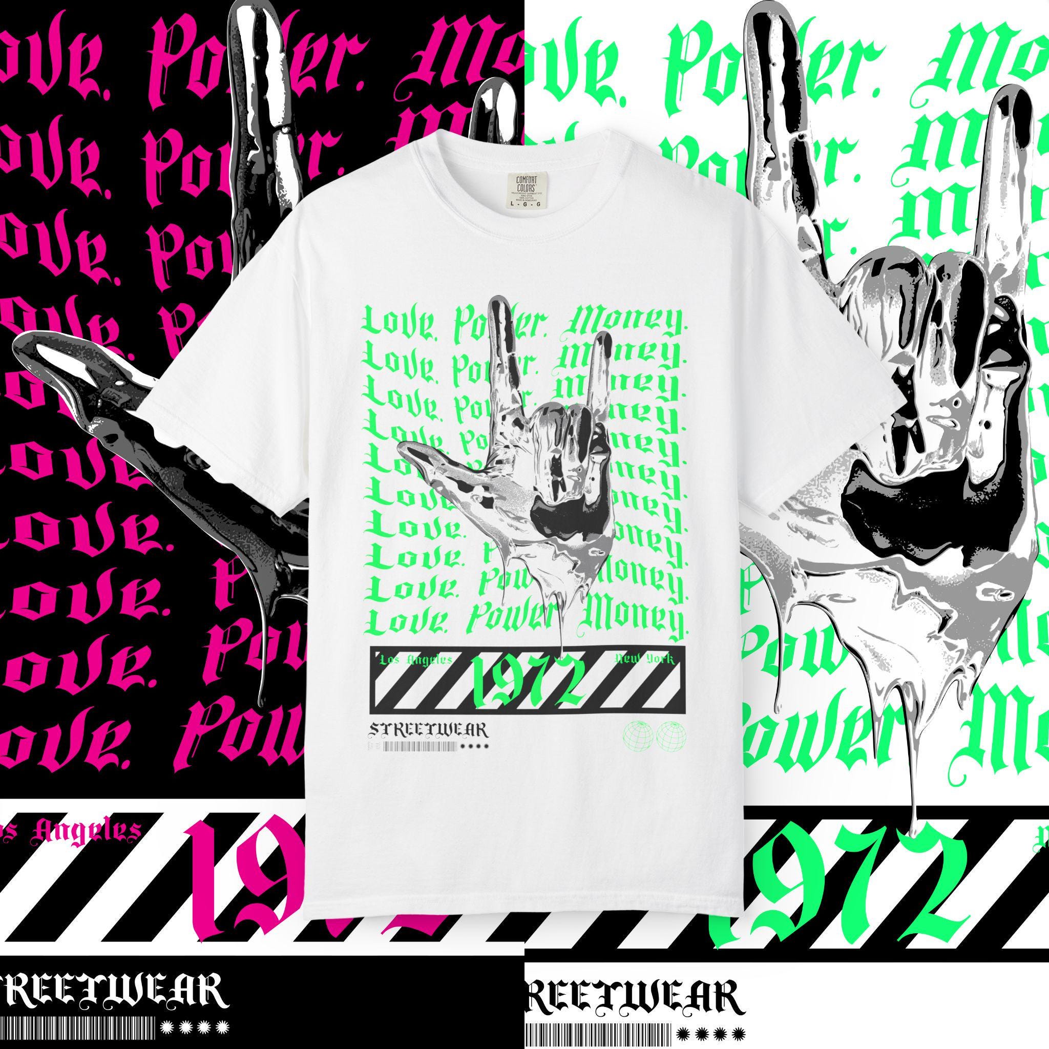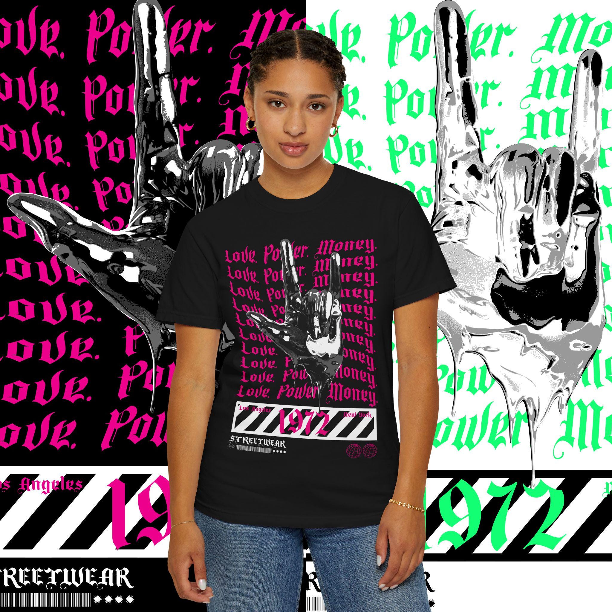 This garment-dyed T-shirt features the words 'love power money' printed on it, giving off a cool and edgy vibe. Perfect for casual wear or dressing up for a night out. Ideal for adults looking to make a statement with their clothing. Great for gift-giving during holidays, birthdays, or special occasions.
