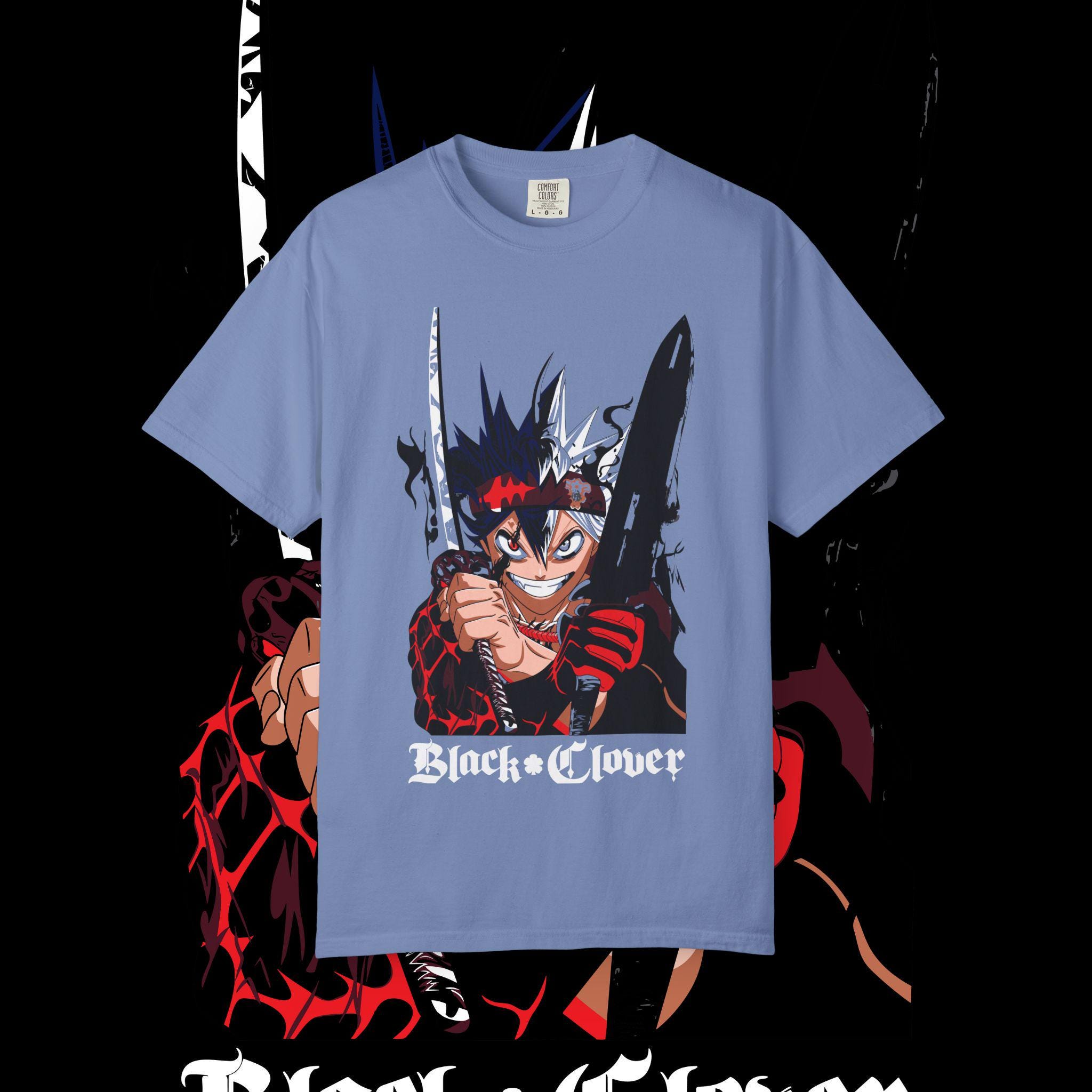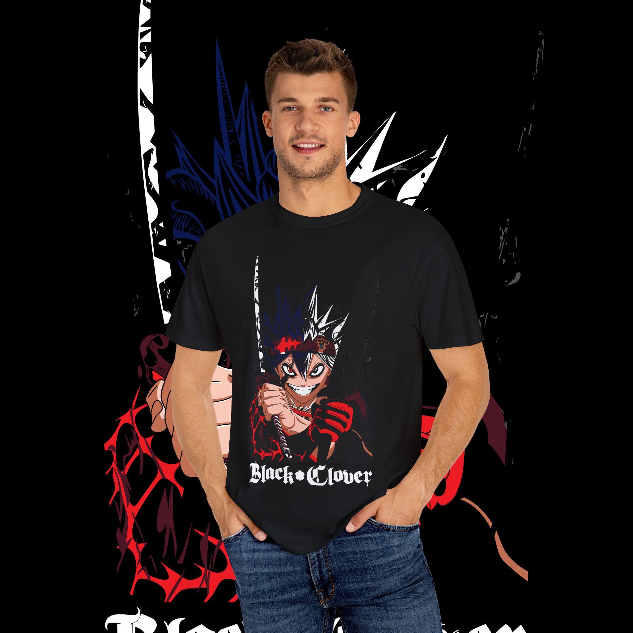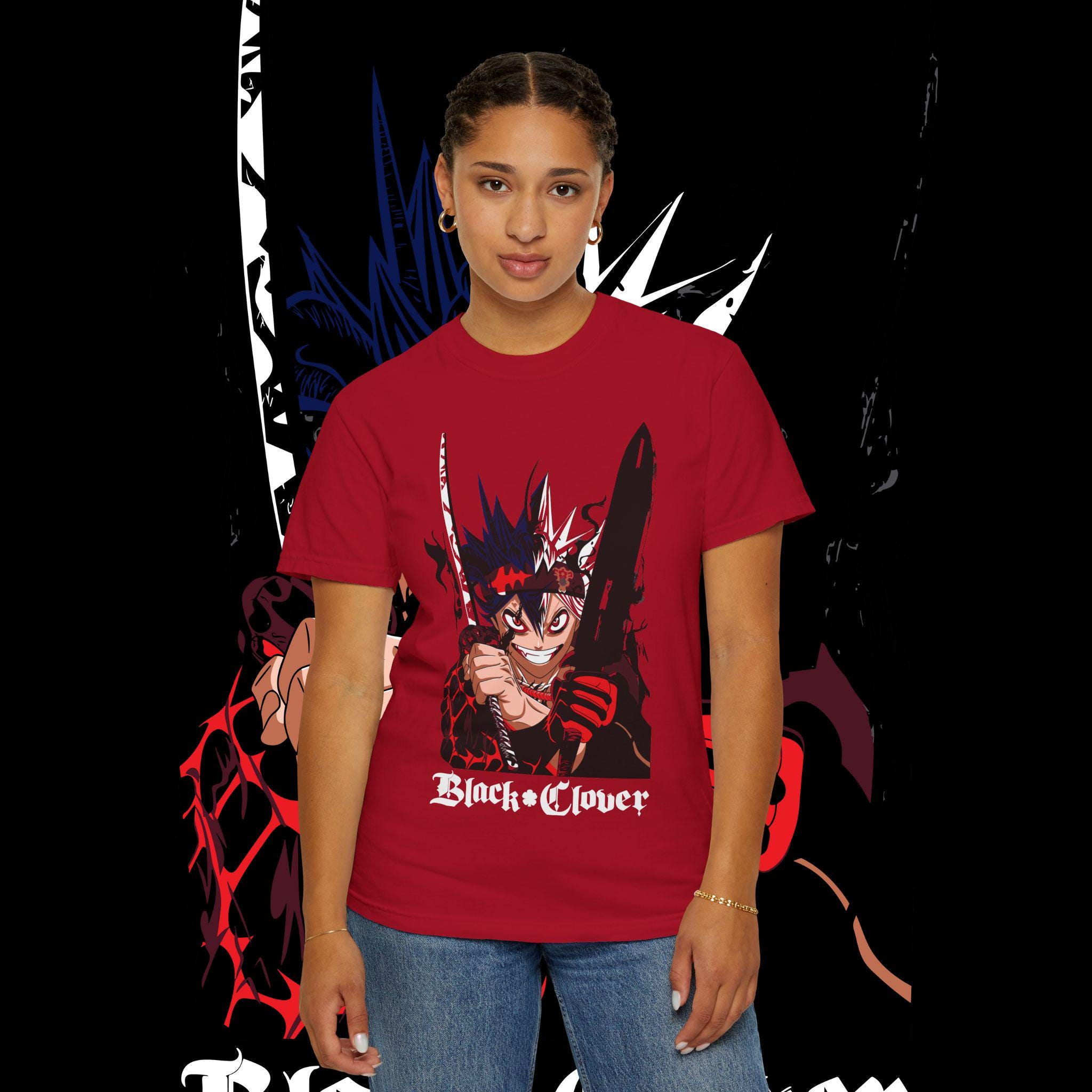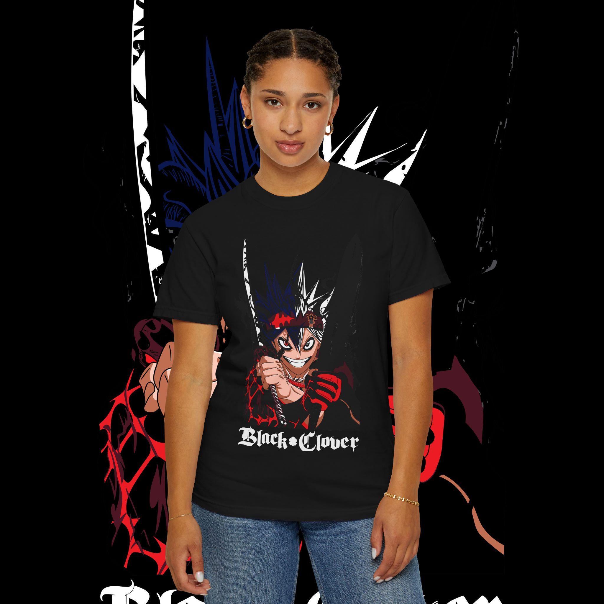 This T-shirt features a design inspired by Black Clover's Asta Demon Form, with striking red and black flames. Perfect for fans of the anime looking to show off their love for the series. This garment-dyed tee gives off a cool and casual vibe, fitting seamlessly into any anime lover's wardrobe. Ideal for wearing to anime conventions, comic con events, or casual hangouts with friends.